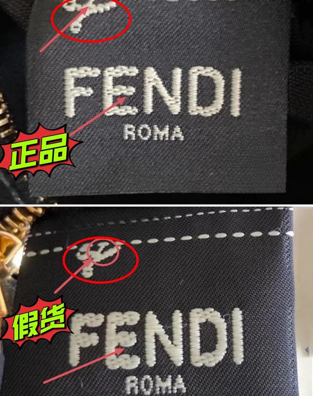 First of all, you can check the "FENDI" and "ROMA" logo printed on the washing label inside the Fendi bag. For real Fendi bags, the letters of "F", "E", "N", "D" and "I" are carefully stitched on the washing label. In the picture below, the upper one is real Fendi bag and the lower one is fake Fendi bag. The logo shows some special characteristics. For example, you can examine the letter "E", the stroke in the middle is shorter than the strokes on the top and in the bottom. But on the fake Fendi bags such as the lower one, the strokes of letters are not clear and tight, and the shape of the letters are also not aligned with the real Fendi Bags.
