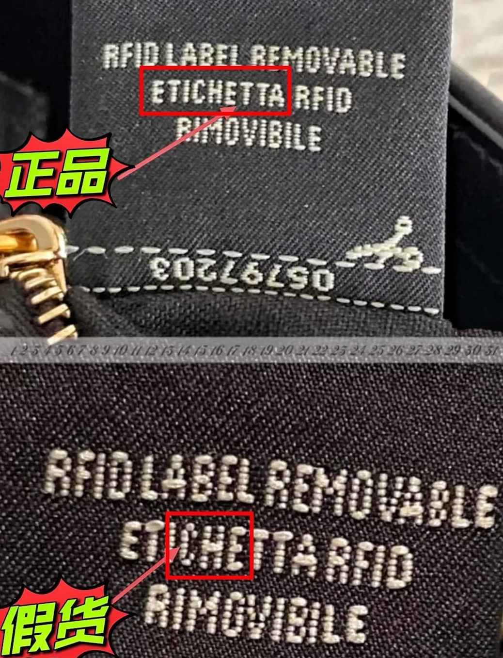 One special design of some models of Fendi bags is the RFID chips inside the washing label for the purpose of authentification. As you can see from the picture below, there is an RFID chip inside the washing label of real Fendi Bags (some series). If some Fendi bags don't have the RFID chips, there is higher chance that the bags are fake. Also you can check the text printed on the label, the English "RFID LABEL REMOVABLE" and Italian "ETICHETTA RFID RIMOVIBILE". As you can see from the picture below, the upper one is from a real Fendi bag and the lower one is from a fake Fendi bag. The text on the fake Fendi bags are not clearly stitched and some letters such as "C" "H" and "E" are stitched with very bad quality.